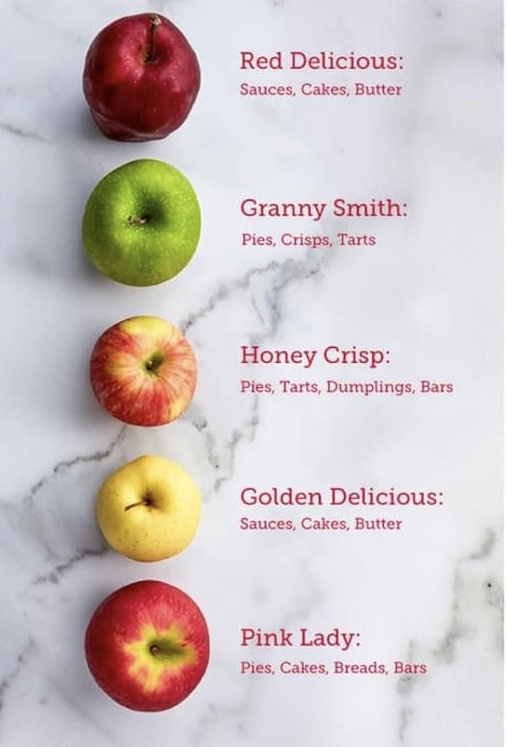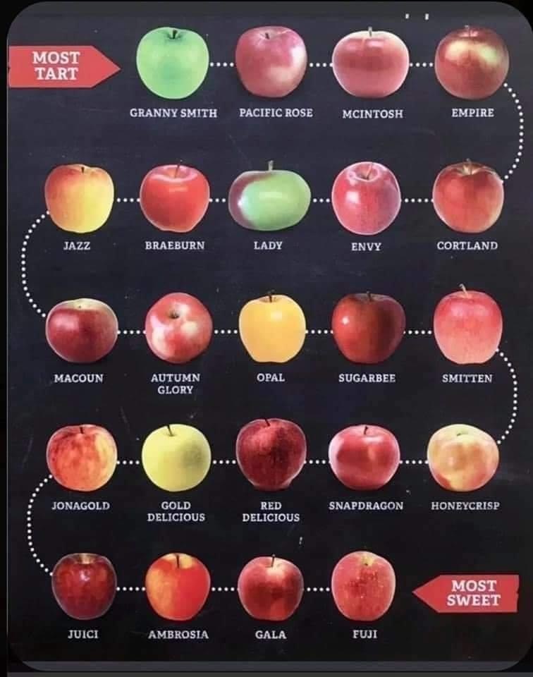 Apples come in an array of variations of red, green, and yellow; have all kinds of interesting names; and generally have different tastes and uses. I like sweet apples, so my choices are usually Fuji or Gala. Above is a handy-dandy list of different apples ranked from “most tart” to most sweet.”
